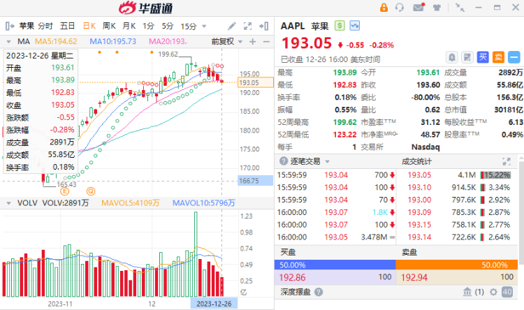 周二,苹果收跌0.28%报193.05美元,总市值3万亿元。