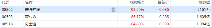 今天港股市场有三只股票盘中出现80%以上的跌幅。宏强控股上午股价出现急速跳水走势,跌幅惊人,盘中跌幅一度高达94.41%,消息面上,宏强控股于12月7日发布第一季度业绩并于当日复牌。据悉,宏强控股于11月15日起停牌。公司当时表示,因集团的某些电脑系统未能正常运作;并导致资料遗失,当中包括与第一季业绩相关的资料。