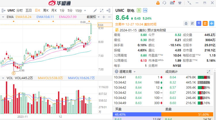 联电(UMC.US)涨5%,报8.62美元。消息面上,供应链消息透露,联电可能会将其12nm制程技术授权给英特尔,双方已接洽多时,近期有望签订合作意向书。主要是因为联电12nm