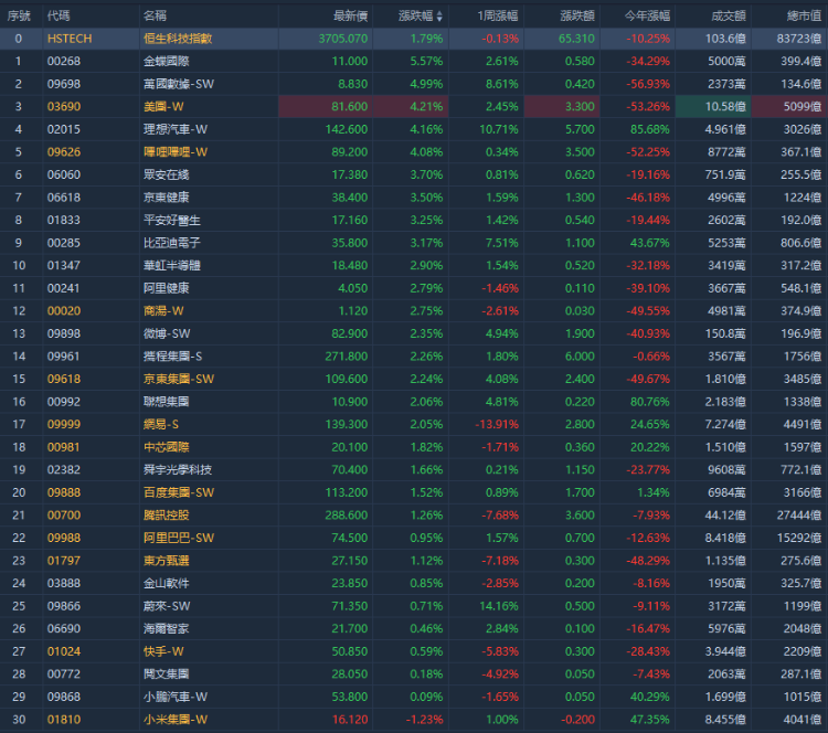 科网股方面,美团,哔哩哔哩涨超4%、网易,京东,百度,腾讯和阿里跟涨。