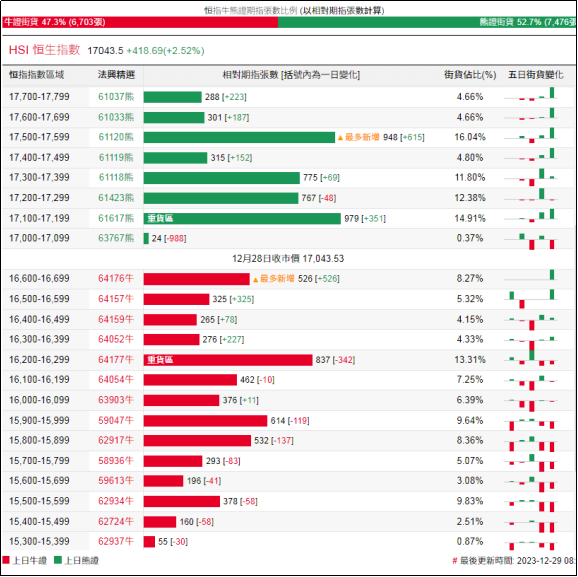 街货分布方面,至周四,恒指牛证街货重货区间主要在收回价15800点至16300点之间,累计相当约2,821张期指合约; 恒指熊证街货重货区主要在收回价17100点至17600点,累计相当约3,784张期指合约。