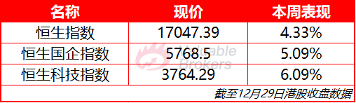 本周恒生指数涨4.33%,报17047.39点;恒生科技指数涨6.09%,报3764.29点;国企指数涨5.09%,报5768.5点。