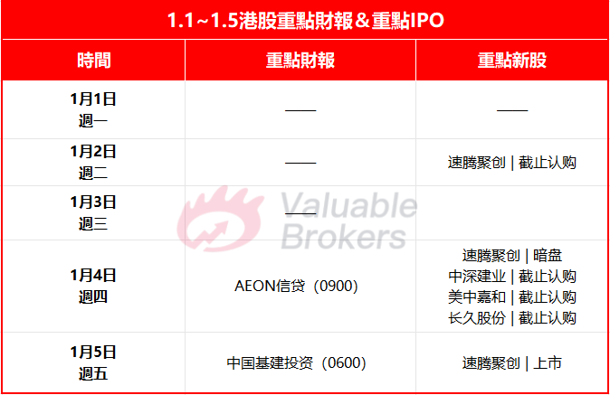 财报方面较为清淡,港股周一休市,后续可关注:周四AEON信贷 $00900.HK 、周五中国基建投资 $00600.HK 。