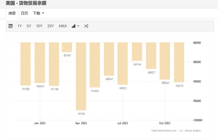 美国商务部公布11月份进出口货物贸易数据,月内出口1,651亿美元,下跌3.6%。进口2,554亿美元,同下滑2.1%。而贸易逆差再扩大至903亿美元,高过预期889亿美元,及上月经修订后898亿美元,并创近4个月最大总额。