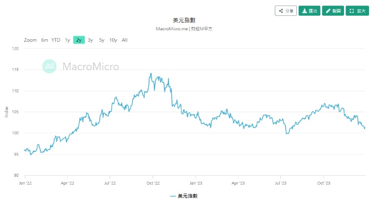 资金由美元区流出,以致美汇指数周内曾跌穿101水平至低见100.61。在芝加哥商品交易所内的利率期货显示,2024年1月加息不足两成,但到3月加息已升至超过84%,到5月的加息机会率更接近百份百。也反映出投资者已预计联储局最少加息3次。也是债券价格及股票市场持续造好的原因。