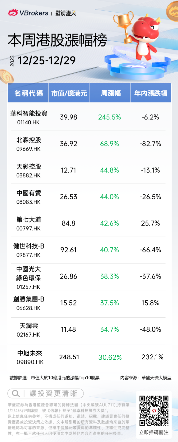 华盛资讯2023年12月30日讯,本周恒生指数涨幅4.33%,报17047.39点;恒生科技指数涨幅6.09%,报3764.29点;国企指数涨幅5.09%,报5768.5点。發仔梳理了每周港股涨跌幅Top10榜单,供投资者参考。