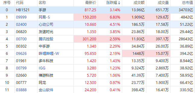 华盛资讯1月2日消息,港股游戏股早盘走强,截至发稿,网易-S涨近7%,心动公司涨超4%,腾讯控股、中手游、哔哩哔哩-W等涨超2%,IGG、禅游科技、金山软件等跟涨。