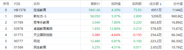 1月2日讯,港股早盘高开低走,教育股逆势走高,截至发稿新东方-S大涨5%,思考乐教育涨超7%,卓越教育集团涨超12%。