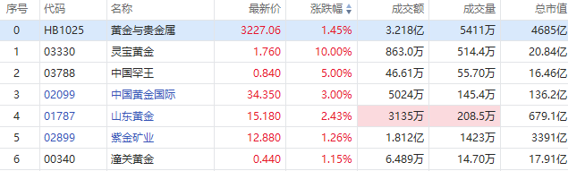 1月2日,黄金股全线上扬,截至发稿,灵宝黄金涨10%,中国黄金国际涨3%,山东黄金涨超2%,紫金矿业、潼关黄金等跟涨。