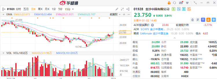 澳门博彩股逆市上升,澳门12月博彩收益按年升逾4.3倍,多过市场预期。金沙 $01928.HK 午后升幅曾扩大至逾半成,创3个月新高,并收复100天移动平均线。