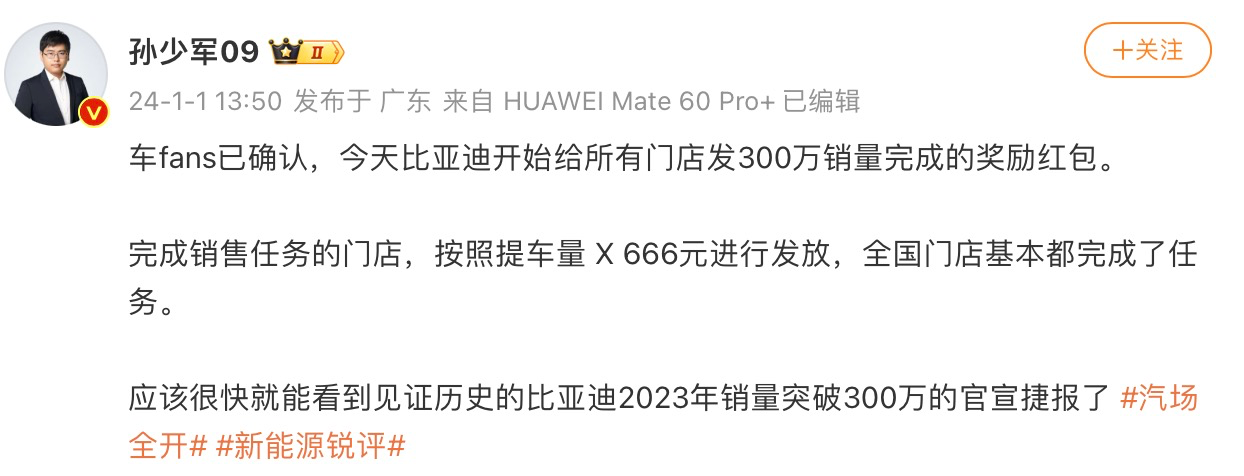 1月1日,知名汽车市场调研机构车fans负责人孙少军透露称,当天起比亚迪开始给所有门店发放300万销量完成的奖励红包。据其表示,完成销售任务的门店,按照每辆车666元的奖励进行发放,全国门店基本都完成了任务。