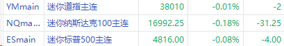华盛资讯1月2日消息,三大期指盘前齐跌,截至发稿,纳指期货 $NQmain 跌0.18%,标普500指数期货 $ESmain 跌0.08%,道指期货 $YMmain 跌0.01%。