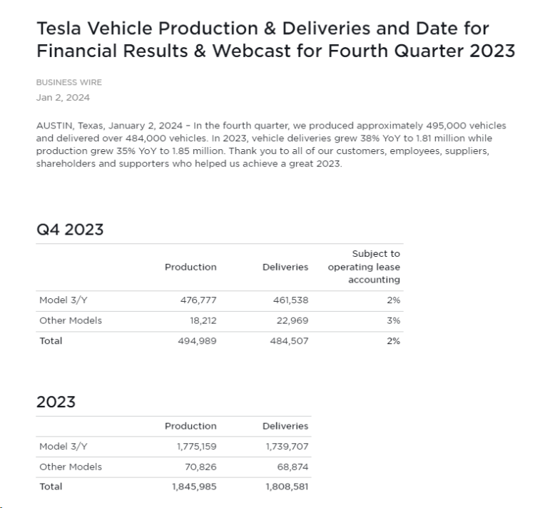 特斯拉2023年第四季度汽车交付量为484,507辆,市场预计为483,173辆。2023年全年车辆交付同比增长38%,达到181万辆,而产量同比增长35%,达到185万辆。
