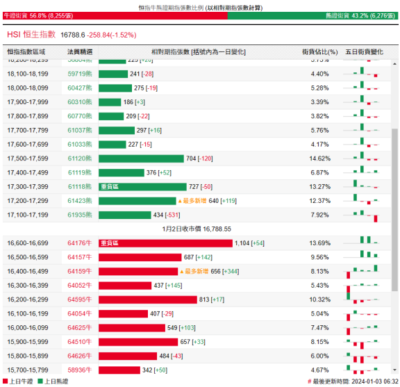 街货分布方面,至周二,恒指牛证街货重货区间主要在收回价16200点至16700点之间,累计相当约3697张期指合约;恒指熊证街货重货区主要在收回价17100点至17700点,累计相当约3108张期指合约。