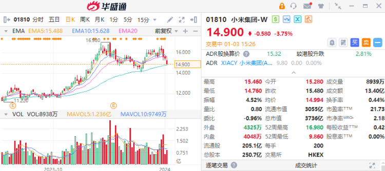 小米集团-W连跌4日,跌穿50天平均线,创逾半个月低位。小米自早前公布新车相关消息后反覆下跌,今进一步跌穿15元关口。