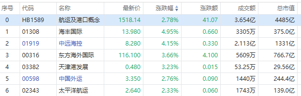 华盛资讯1月4日消息,港股航运股早盘涨幅居前,截至发稿,海丰国际涨5%,中远海控涨超4%,东方海外国际、太平洋航运涨超3%,中远海能等跟涨。