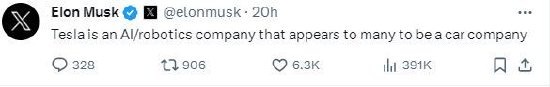 马斯克在这条帖子下回应称:“特斯拉是一家AI/机器人公司,虽然在很多人看来是一家汽车公司。”