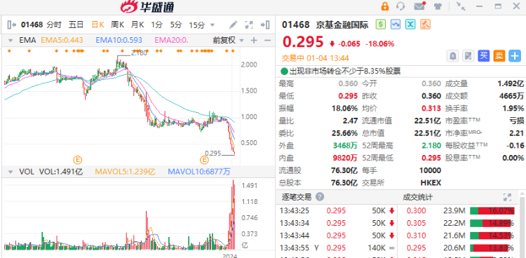 1月4日讯,港股京基金融国际(01468)跌超18%,截止发稿报0.295港元,成交额4063万港元。值得注意的是公司股价近期七连阴,跌幅累计超70%。