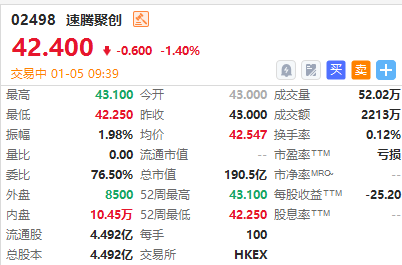 华盛资讯1月5日消息,速腾聚创今日挂牌港交所上市,截至发稿,开盘跌1.4%,最新总市值190.5亿港元。
