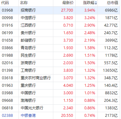 1月5日,内银股普涨,截至发稿,招商银行涨近4%,中信银行涨超3%,邮储银行涨超2%,浙商银行、工商银行、中国银行涨超1%,中国光大银行、中银香港跟涨。