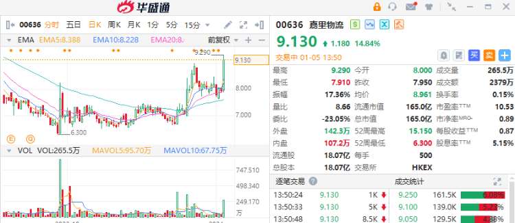1月5日忙,港股嘉里物流盘中一度大涨近17%,最高报9.29港元刷新阶段高价,截至发稿涨幅缩窄至近15%,总市值165亿港元。
