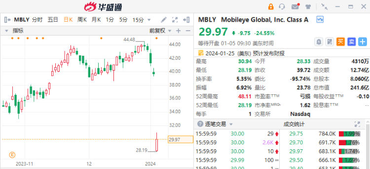 美东时间1月4日,全球最大的自动驾驶技术制造商之一Mobileye Global $MBLY 惨遭滑铁卢,股价暴跌四分之一,市值蒸发约80亿美元。