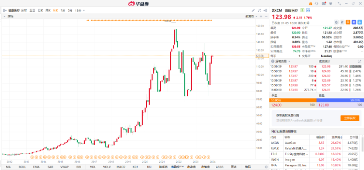 涨幅第七名的是德康医疗(DXCM.US),这家公司会比其他几家小公司更出名一些,自2008年以来涨幅超过200倍,市值在471亿美元。