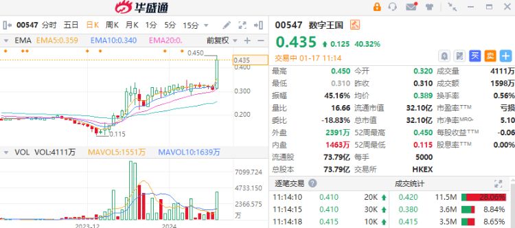 1月17日讯,港股数字王国早盘逆势暴涨40%,2023年12月以来大涨240%,截至发稿,涨29.03%,报0.40港元,成交额1589万港元。