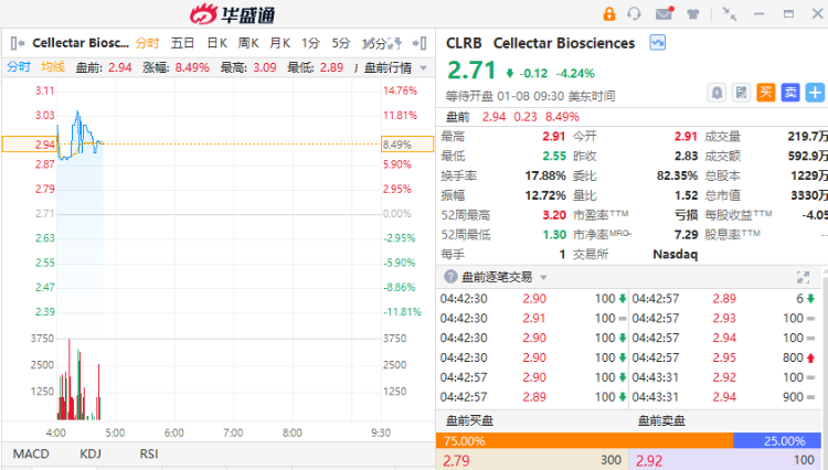 生物制药公司Cellectar BioSciences盘前涨超8%。消息面上,Cellectar BioSciences管理层将于美国东部时间2024年1月8日星期一上午8点主持电话会议,详细介绍其治疗Waldenstrom巨球蛋白血症的iopofosine I 131关键试验的主要数据。
