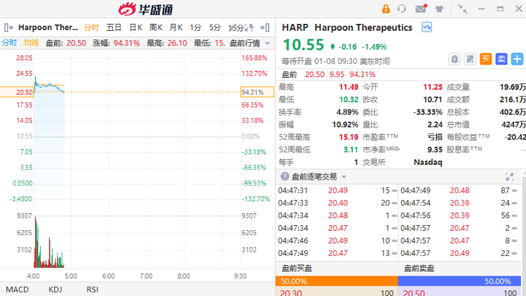 免疫治疗公司Harpoon盘前暴涨超90%,消息面上,默沙东正在讨论以约7亿美元或每股23美元的价格收购Harpoon,较上周五10.55美元的收盘价溢价118%。