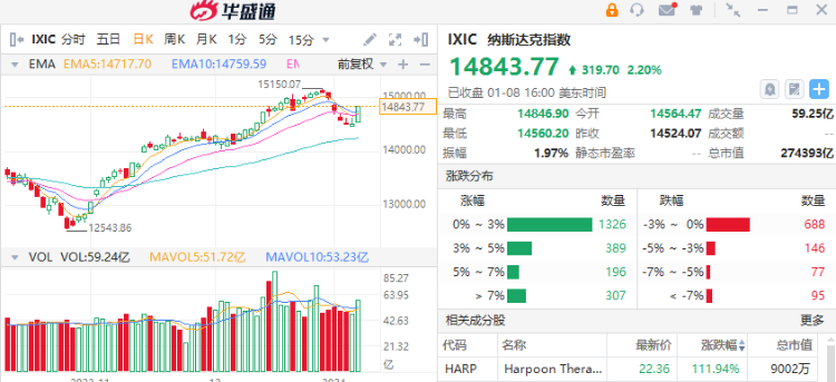 截至收盘,道指涨216.90点,涨幅为0.58%,报37683.01点;纳指涨319.70点,涨幅为2.20%,报14843.77点;标普500指数涨66.30点,涨幅为1.41%,报4763.54点。