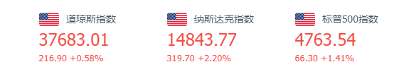 美股三大股指周一收高,道指涨0.58%,标普500指数涨1.41%,纳指大涨2.20%;科技股涨幅领先,苹果收高2.42%,官宣Vision Pro上市时间表 ;英伟达大涨6.43%创历史新高, $AMD 涨超5%;波音暴跌8%,多国停飞旗下客机。