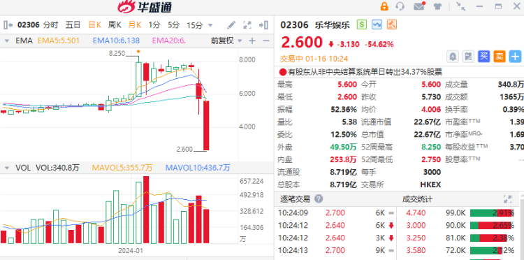 1月15日讯,港股乐华娱乐今日股价闪崩54%,股价昨日暴跌32%;截至发稿报5.35港元,创上市以来新低,当前成交额1365万港元。