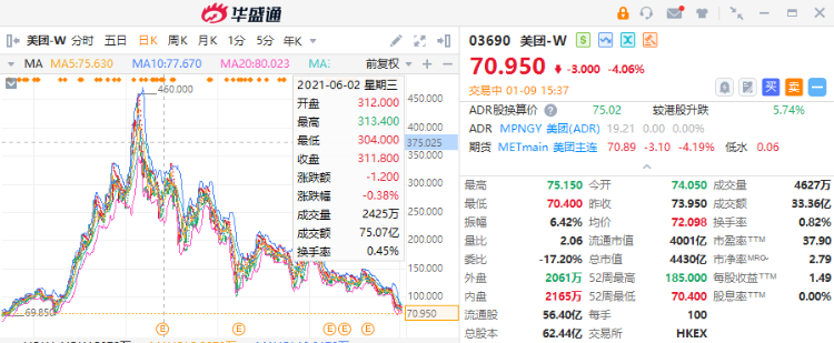 美团-W $03690.HK 冲高回落,截至发稿,跌4.06%报70.95港元,成交额33.36亿港元。截至目前,美团年内跌幅超过13%,创2020年3月以来新低。