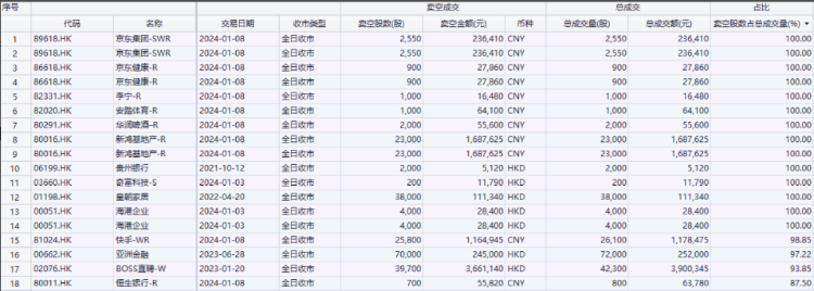 其中在1月3日到8日期间,京东健康-SWR的卖空股份占总成交量100%。同期的京东集团-SWR也是如此。而根据京东集团-SW(09618.HK)在1月3日到8日期间的卖空比例维持在21%-25%区间。