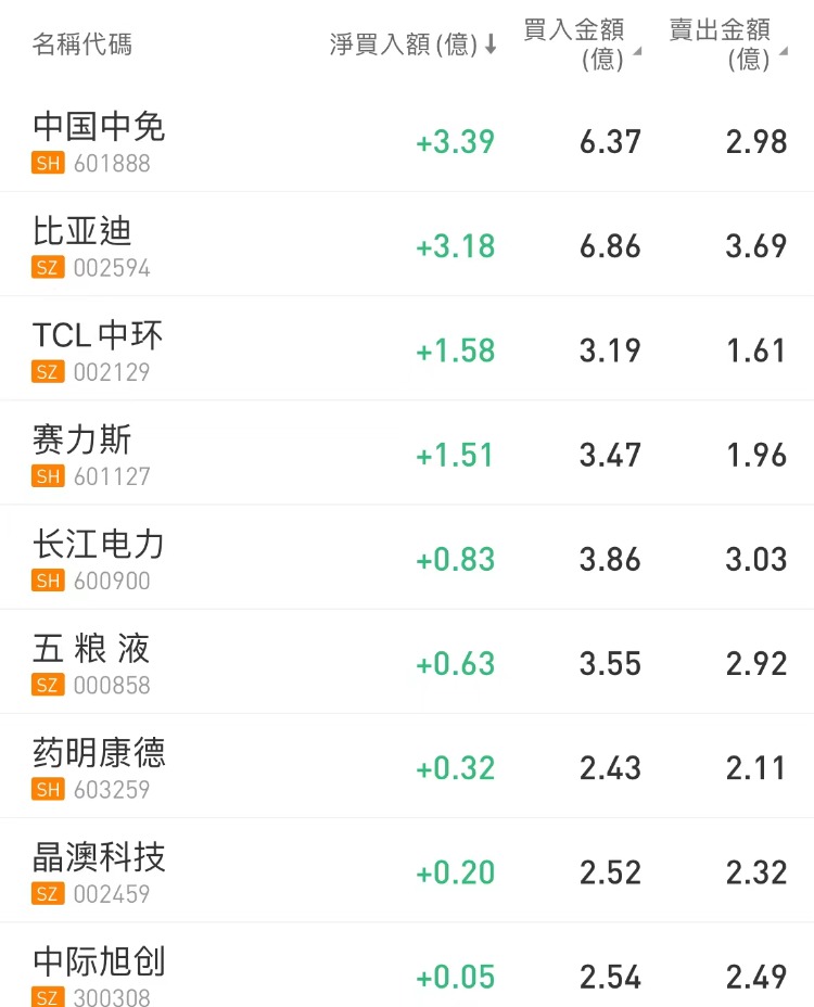北向资金今日净买入0.19亿元。中国中免、比亚迪、TCL中环分别获净买入3.39亿元、3.18亿元、1.58亿元。贵州茅台净卖出额居首,金额为3.9亿元。