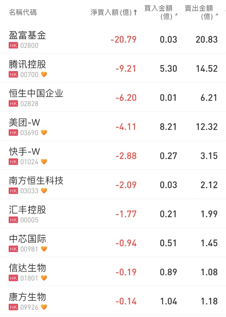 南下资金今日净卖出盈富基金20.79亿港元,腾讯9.21亿港元,恒生中国企业6.2亿港元,美团-W4.11亿港元;净买入中国神华1.49亿港元,中海油1.28亿港元。据统计,南下资金已连续10日加仓中海油,共计35.72亿港元;连续11日加仓中国移动,共计31.25亿港元;连续4日净卖出腾讯,共计32.83亿港元。