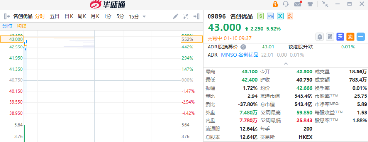 名创优品(09896)早盘高开高走,现涨超5%,截至发稿,报43港元,成交额783万港元。