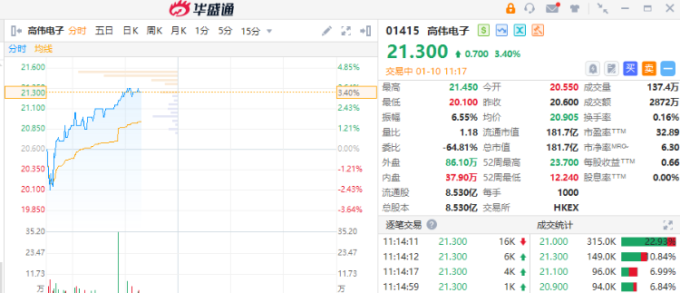 高伟电子(01415)涨超3%,截至发稿,涨3.4%,报21.3港元,成交额2872万港元。