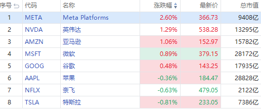 华盛资讯1月10日消息,美股早盘,明星科技股走势分化,截至发稿,Meta涨近3%,英伟达、亚马逊涨超1%,微软、谷歌跟涨;奈飞、特斯拉跌近1%。