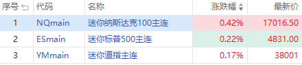 华盛资讯1月11日消息,三大期指盘前走强,截至发稿,纳指期货 $NQmain 涨0.42%,标普500指数期货 $ESmain 涨0.22%,道指期货 $YMmain 涨0.17%。
