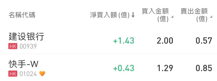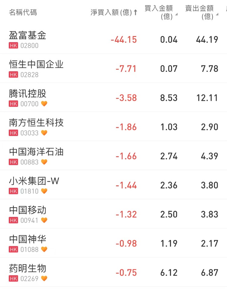 南下资金今日净卖出盈富基金44.15亿港元,恒生中国企业7.71亿港元;净买入建设银行1.43亿港元、快手-W0.43亿港元。