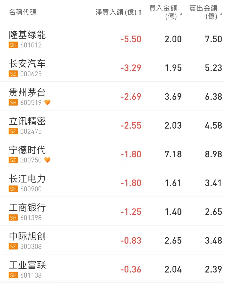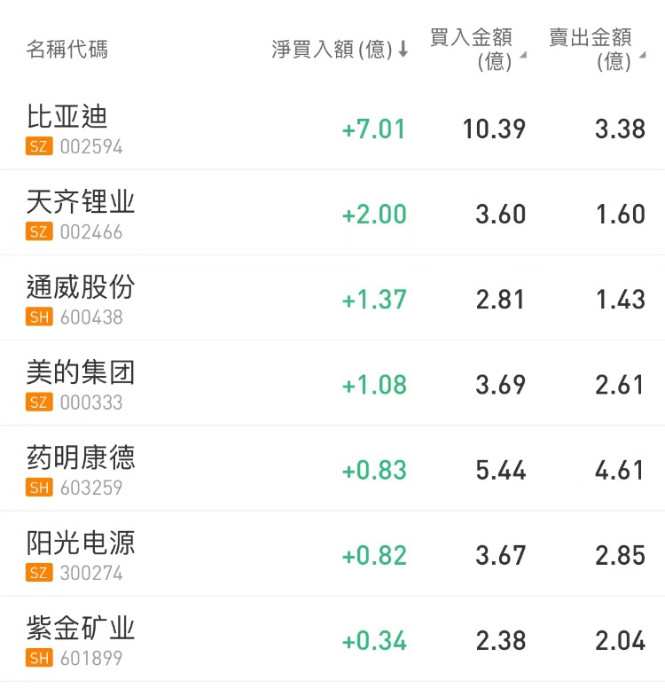 北向资金今日净买入42.31亿元。比亚迪、天齐锂业、通威股份分别获净买入7.01亿元、2.0亿元、1.37亿元。隆基绿能净卖出额居首,金额为5.5亿元。