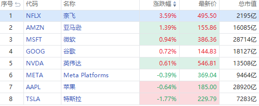 明星科技股走势分化,截至发稿,奈飞涨超3%,亚马逊涨超1%,微软、谷歌、英伟达跟涨;特斯拉跌近2%,苹果、Meta微跌。微软市值一度超越苹果,成为美股市值最大的公司。