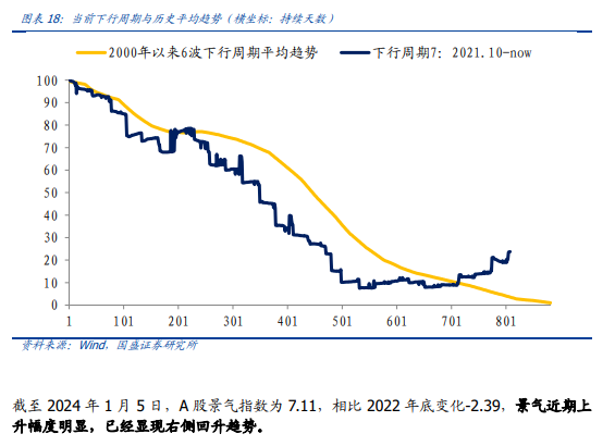国盛证券以上证指数归母净利润同比为 Nowcasting 目标构建A股景气度高频指数(对于上证指数净利润同比同步预测的方向胜率达到 81.48%)。本轮景气下行周期起始于 2021年 10 月,至今已经过 27 个月,历史景气下行周期平均持续 1.9年(23个月左右 ),从时间和幅度来看目前处于下行结束的底部震荡时点。