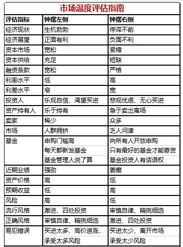 当我们参照霍华德马斯克在《周期》一书中列出的经典“市场温度评估指南”,按照现状对每一项评估指标来划勾,再比较一下钟摆右侧和钟摆左侧的勾的数量,也许对于当下的投资,应该秉持什么风格、杜绝什么错误有个大致的预判了。(完)