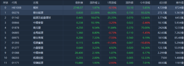 中国神华(01088):中国最大的煤炭生产企业,该公司11月接受投资者调研时称,随着国家最新一轮的优化电源点布局工作推进,公司抢抓“十四五”期间的火电发展窗口期,在既有优质电源点开展改扩建项目。公司目前在建电厂项目预计将于2025年及以前完工投运。