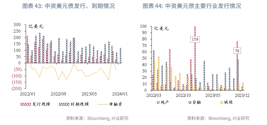 2023年以来中资美元债发行整体疲弱、高收益地产债大幅下跌。年内中美利差倒挂加深、令美元债发行意愿整体偏弱。中资美元债全年发行规模较2022年下降42%至741.3亿;其中城投、金融债发行额同比分别下跌78%、21%,融创等房企年内完成美元债务重组,带动地产美元债发行规模增长21.90%。二级市场投资级债券年内录得增幅,但房企信用风险仍存、融资端压力尚未明显缓解,仍抑制市场情绪回暖,高收益级地产债指数年内累跌约51%。