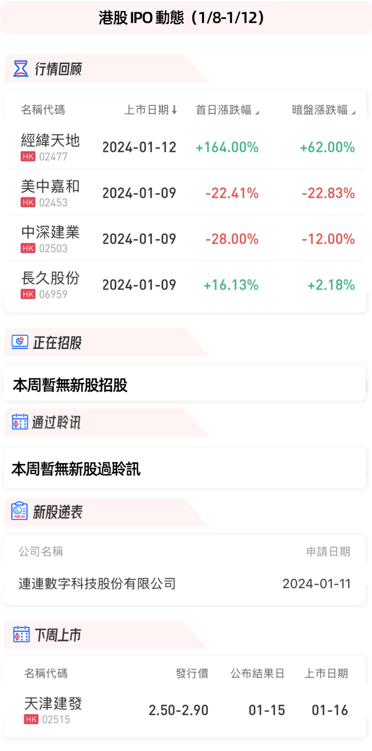 1月12日,经纬天地正式登录港交所,首日涨164%,报2.64港元。