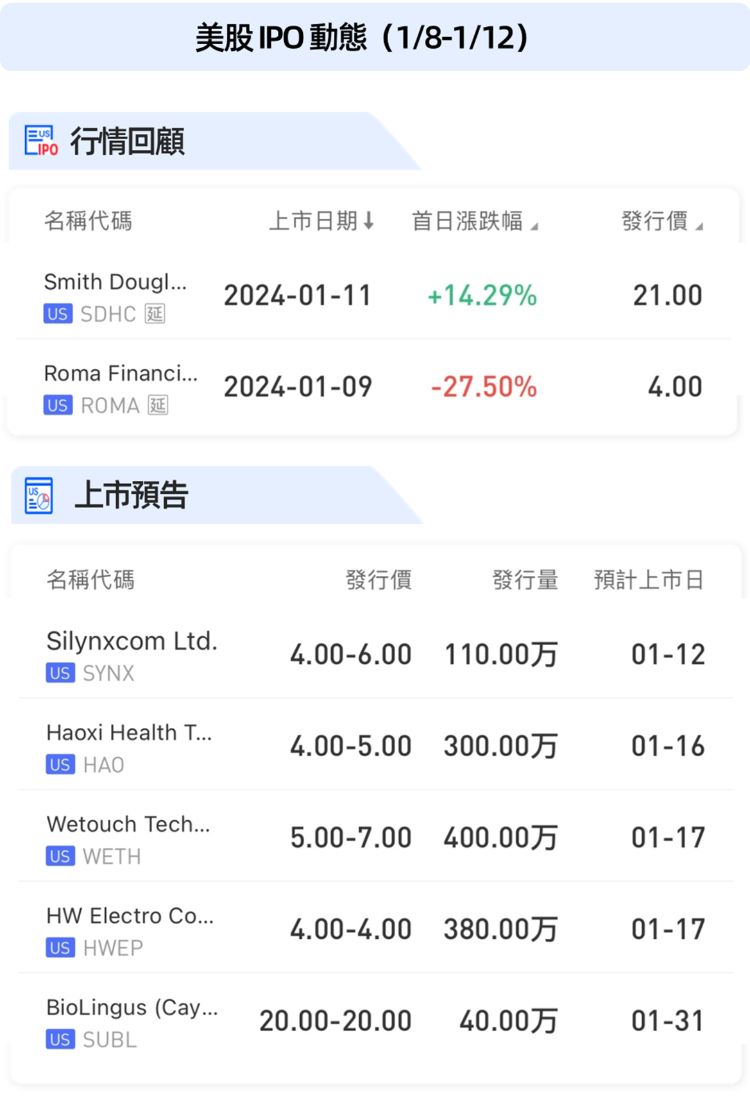 Silynxcom Ltd.预计将于今晚(1月12日)上市,Haoxi Health Technology Ltd. $HAO 将于1月16日上市,Wetouch Technology $WETH 、HW Electro Co., Ltd $HWEP 将一起于1月17日上市,BioLingus(Cayman) Ltd. $SUBL 将于1月31日上市。